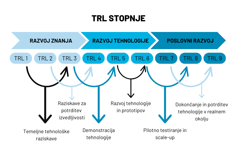 - Za komercializacijske projekte pa se zahteva višji TRL, običajno 6-9.